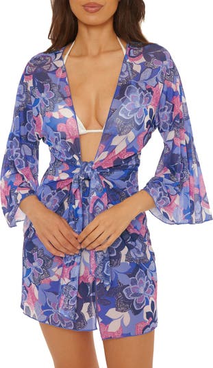 Patterned mesh details this cover-up tunic designed with a tie front that makes it perfect for throwing on after a day by the water.