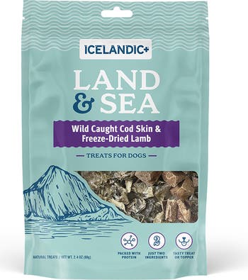 ICELANDIC+ LAND & SEA WILD-CAUGHT COD SKIN & FREEZE-DRIED RAW LAMB DOG TREATS – the healthy, grain-free, 100% natural dog treats your pup will love. Crafted with sustainably sourced proteins, these treats offer a unique taste and texture variety, combining diced lamb and crunchy cod skin. Each bite is packed with protein, vitamins and omega-3s, supporting your dog's health and vitality. With only two ingredients, these treats are ideal as a snack, training treat or food topper. • Raw lamb – free-roaming, grass-fed, rich in amino acids to support your dog’s health • Freeze-dried in small batches, packed with raw, whole-food nutrition • Gently air-dried wild-caught cod skin loaded with naturally occurring omega 3’s for eye, brain skin & coat support • Easily digestible, low calorie treat • 100% natural, no additives, preservatives or fillers • Easily digestible • Flavor and texture variety to keep dogs interested • Perfect snack for dogs with food sensitivities • Grain-free, gluten-free
