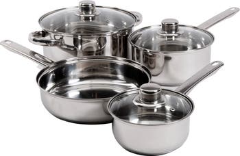 The Landon 7 Piece Cookware Set includes every cookware essential to whip up delicious dishes. The timeless mirror polished stainless steel will resist time, rust and stains for a lifetime of sheen and quality. It features hollow stainless steel handles that stay cool to the touch for full control and a safe cooking process. The aluminum-encapsulated base ensures optimal heat distribution for an even cooking of your foods. It also comes with vented tempered glass lids to quickly and effortlessly monitor the cooking process. Includes one of each: 4 qt. Dutch oven with lid, 2 qt. saucepan with lid, 1 qt. saucepan with lid and 9 in. frying pan
