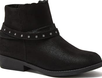 Our Girl's Shimmer Zip Up Western Bootie is the perfect energizing addition to your child's closet. A glitter-infused microsuede upper material and lively straps are just as ready for a weekend farmer's market as they are for twirling in the park. Full of dazzling design details, including a scalloped edge for an exclusive finish, they pair with her most loved dress or those jeans she loves so much. The interior zipper makes shoe removal easy and parent-free. A durable TPR outsole and synthetic microsuede upper keep her feet sheltered even in the worst weather. Offered in three colors: Black Shimmer, Taupe Shimmer, and Platino Shimmer. in kids' sizes Little Kid 11 to Big Kid 7.