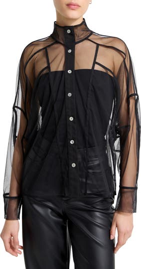 Sculptural seams highlight the airy mesh of this sheer button-front shirt that's a stunning statement style.