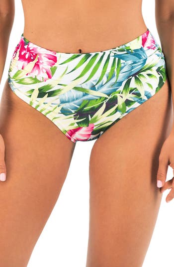 Gently gathered sides accentuate the flattering style of full-coverage bikini bottoms covered in a tropical pattern.