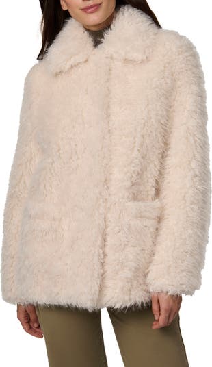 Cozy faux fur with a soft, curly texture elevates this classic coat into a standout layer for cold-weather dressing.