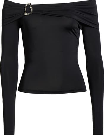 High-shine hardware elevates this shapely stretch-kissed top meant to show off your shoulders.