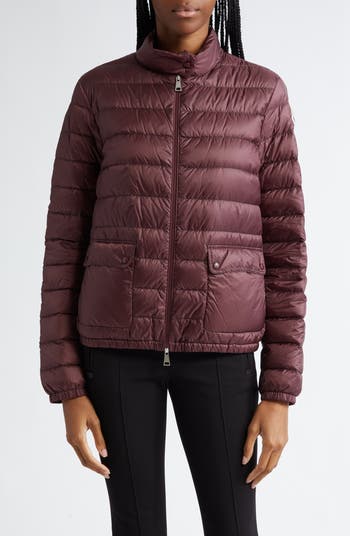 A slim fit and a moto-inspired design define this channel-quilted jacket crafted of silky nylon and insulated with lofty down fill.