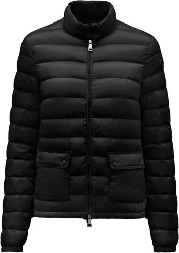 A contrast panel at the back with a minimalist logo brings signature Moncler panache to a down-filled, channel-quilted jacket topped with a cozy stand collar.