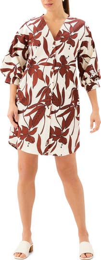 A high-contrast floral pattern plays across this lantern-sleeve shirtdress made of breathable cotton with just a little bit of stretch for comfort.