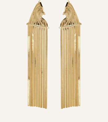 Evoking the emblematic ribbon, Jeanne Lanvin's iconic signature and symbol of love, these gold chain drop earrings reveal the delicacy of a multitude of small intertwined links. Their refined, contemporary design adds a touch of elegance and lightness to any outfit, perfectly embodying the chic spirit of the House.