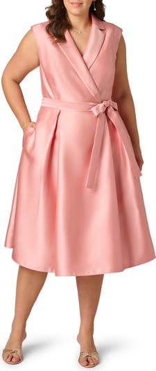 This sleeveless mikado midi dress is tailored in a refined fit-and-flare silhouette, featuring a notch lapel neckline, faux wrap bodice and tie belt that defines the waist. Structured pleats add graceful volume to the skirt, while side pockets provide a handy finishing touch.