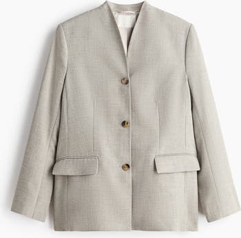 Single-breasted blazer in woven fabric with a lapelless neckline and jetted front pockets with a flap. Shoulder pads, a slit at the cuffs and a single-back vent. Lined.