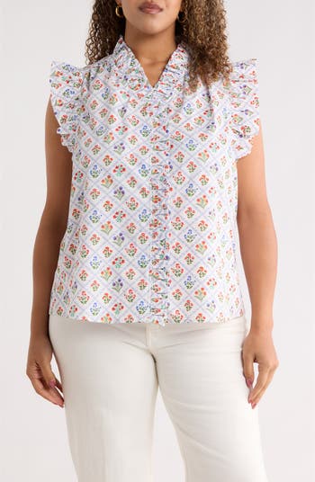 Fanciful frills add charm and dimension to this crisp poplin top cut with a high neckline and finished with a tuckable shirttail hem.