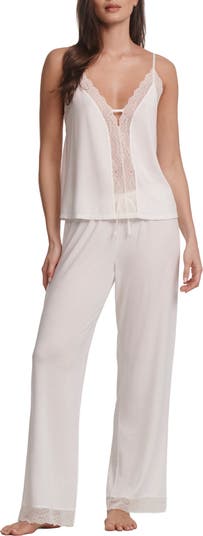 Delicate lace trim brings a sweet and sassy vibe to a cuddly set of PJs that pair a strappy camisole with full-length, wide-leg pants.