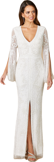 Beaded v-neckline sheath gown. The gown features long sleeves with front slit