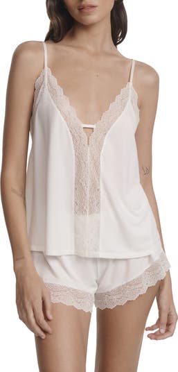 Dainty lace trim brings romance to this pajama set comprised of a stretchy camisole paired with matching shorts.