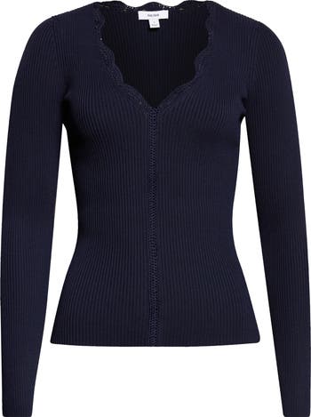 This clingy rib-knit top plays it close with a flattering, body-skimming fit and a scalloped V-neckline that draws the eye. Delicate openwork trim runs from the base of the V to the hem, adding just a hint of intrigue to an otherwise sleek silhouette.