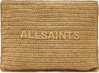 Tonal logo embroidery adds a signature touch and highlights the woven exterior of a slender clutch featuring an oversized profile perfect for stylishly carrying your essentials.