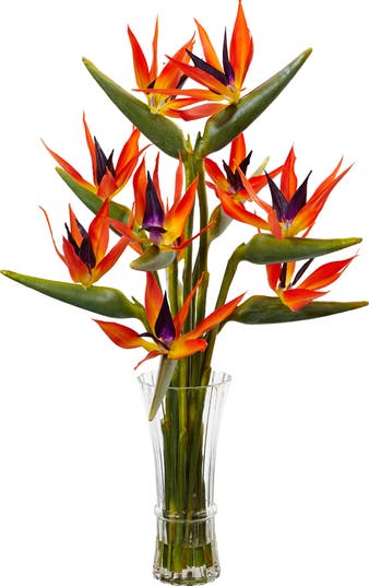 Fiery shades of color burst from this 32" tall Birds of Paradise arrangement for a unique, show stopping piece. With adjustable stems of handcrafted material, each bloom offers a burst of color in tropical shades of orange and purple. Place as the centerpiece for a dining table or at the entryway for a summertime look that lasts year round.