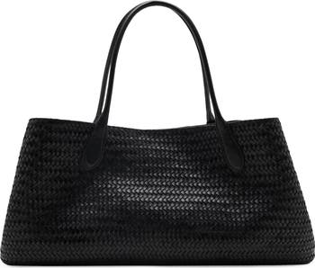 Smooth and finely braided leather bring textural interplay to a spacious bag suspended from a pair of slim shoulder straps for comfortable carry.