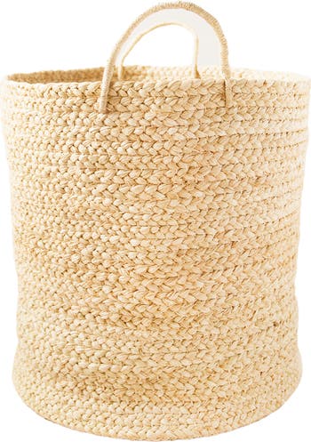 This item has an additional $25 shipping & handling fee. Behind the Design: We partner with artisans in Rwanda who make handwoven platters and baskets using raffia: a straw-like fiber that can be stripped from the inside of palm tree leaves. The fibers are found only in a special species of palm tree that grows abundantly across sub-Saharan Africa. The artisans weave the raffia fibers using a needle and thread, creating a range of shapes, designs, and products that look beautiful in natural raffia tones or when hand-dyed. *This item is excluded from gift wrap Details double handle floor basket natural braided raffia locally sourced natural fibers 20" H x 22” W (26" H with handles)