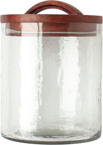 Beautifully textured glass paired with a hand-carved wooden lid makes these canisters the ultimate in stylishly functional home organization. Perfect for use in the kitchen or as an apothecary jar, each includes a rubber ring for an airtight seal. 5" x 7"Recycled Glass Made in India