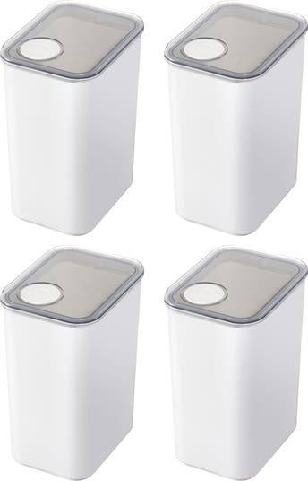- AIRTIGHT CANISTER - The iDesign Eco System Airtight Kitchen Canister elegantly decants flour, sugar, rice, and other dry goods, lending a clean, classic look to any pantry or open shelving; The airtight, lift-off lid keeps contents fresh, while the clear container allows you to keep an eye on supply levels so you will never run out of your favorite ingredients again; Its stackable, space-saving design makes this an instant pantry favorite; Set of 4