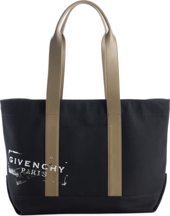 Weathered logo lettering lends a timeworn look to a capacious canvas tote wrapped with calfskin leather handles fashioned with comfortable rolled grips.