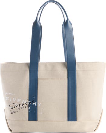 Weathered logo lettering lends a timeworn look to a capacious canvas tote wrapped with calfskin-leather handles fashioned with comfortable rolled grips.