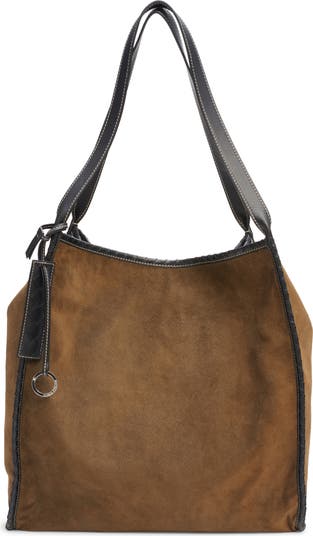 The Italian label's iconic intrecciato weave appears at the trim and patch pocket of this roomy tote that reverses from buttery suede to durable canvas.