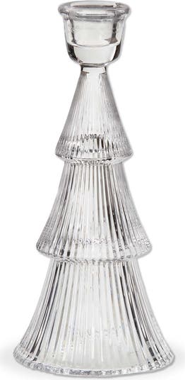 Add a touch of elegance to your holiday decor with this Glass Ribbed Tree Taper Holder. Made from soda lime glass, this holder is shaped like a Christmas tree and is perfect for holding a 10-inch taper candle.