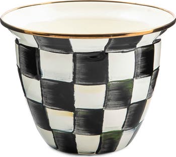 Add a touch of sophistication to your garden or indoor space with this flower pot hand-painted with signature color-dragged Courtly Checks. The pot is made from heavy-gauge, hand-glazed steel and rimmed in bronzed stainless steel.