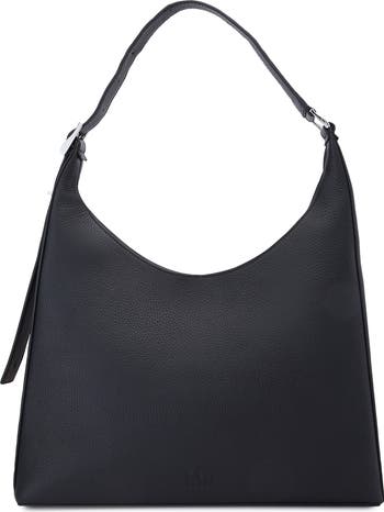 Clean lines and a structured profile define a supple leather shoulder bag designed with a spacious interior and suspended from a single strap that adjusts for versatile wear.