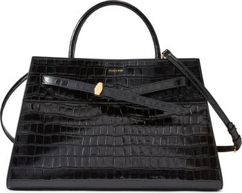 A belt with gleaming hardware cinches the structured profile of this croc-embossed leather tote featuring a pair of rolled top handles and an optional crossbody strap for hands-free carry.