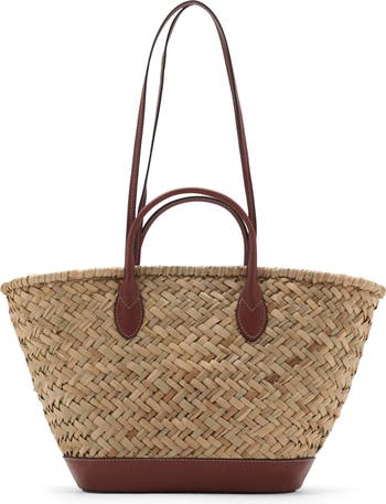 Finely woven straw and smooth faux leather create textural interplay on a spacious bag secured with a drawstring closure and suspended from multiple straps for versatile carry.