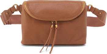 Polished hardware and richly textured leather distinguish an organized belt bag fitted with an adjustable strap for versatile wear.