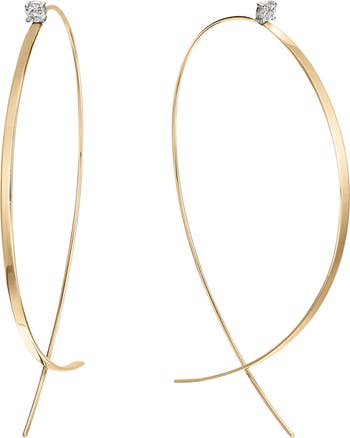 Part of our online trunk show, this style is available for a limited time from November 10 through December 23. A single icy diamond rests atop these upside-down hoop earrings that thread through your lobes and are forged from warm 14-karat gold.