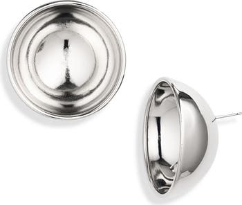 A hollow, half-sphere shape cups light right at the center of these statement-sized stud earrings dipped in palladium.
