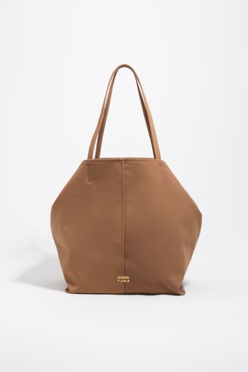 Large shoulder bag with two handles and an adjustable fabric strap. Designed with leather details and a metallic BIMBA Y LOLA logo, it features a lobster clasp fastening and double zip pockets