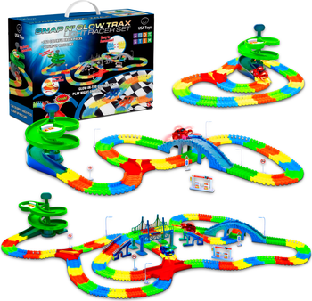 STEM BUILDING RACE CAR TRACKS SET: Create your own race car track designs with this complete buildable race car track set for kids; includes 360 neon car tracks, 2 LED race car toys (batteries not included), 2 bridges, 2 slope frames, 2 lane connectors, and 1 large turnabout ramp GLOW IN THE DARK TOY RACE CARS: Race your LED light up toy cars on various race car track designs that you create from donut-style speedways to long and winding slot car race tracks FLEXIBLE RAINBOW RACE TRACKS: Easily snap these bendy race track for toddlers together and start racing; kids race track rolls up for travel and storage LEARN WHILE YOU PLAY: These colorful STEM building toys help develop kids’s engineering and problem solving skills while enhancing cognitive skills as they play; rainbow racetrack combines hands-on fun with fine-tuning motor skills for kids ages 3+ KID-FRIENDLY AND QUALITY ASSURED: The Glow Trax glow in the dark car racetracks for kids is fun and brain challenging at the same time