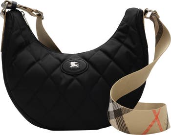 Inspired by country pursuits, a crossbody bag made from quilted nylon. The Horseshoe design features tonal leather trims and our Knight stamp, an archival motif first seen on Burberry bags in the 1980s. Switch from a shoulder to a crossbody bag using the adjustable Burberry Check webbing strap.||Adjustable webbing strap|Zip closure|Hand-painted edges|Brushed metal hardware|Leather patch with Equestrian Knight Design at front|Nylon lining|Comes with a dust bag