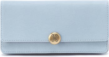 Brushed antique hardware highlights the textured leather exterior of a slender continental wallet fitted with ample compartments for storing your cards, cash and coins.
