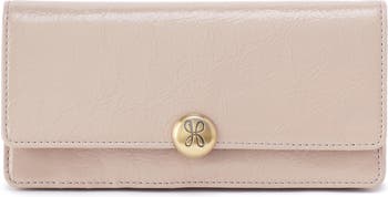Brushed antique hardware highlights the textured leather exterior of a slender continental wallet fitted with ample compartments for storing your cards, cash and coins.