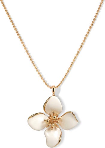 Architectural pendant inspired by garden blossoms with oversized enamel petals for a maximalist statement look.