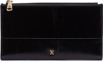 Brushed antique hardware and top-grain leather distinguish a slender wallet designed with ample compartments for securing your cards, cash and coins.