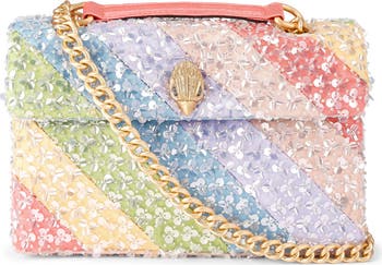 Light-catching sequins highlight the structured profile and colorful stripes on a glamorous bag suspended from a chain strap that converts for shoulder or crossbody wear.