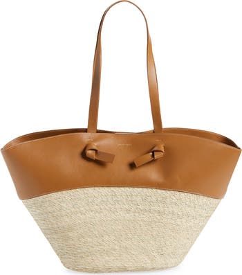 Crafted from a combination of soft leather and summery straw, this Spanish-crafted tote is finished with a glinting goldfoil logo and playfully knotted shoulder straps. A zip pouch helps keep small items organized within the roomy interior.