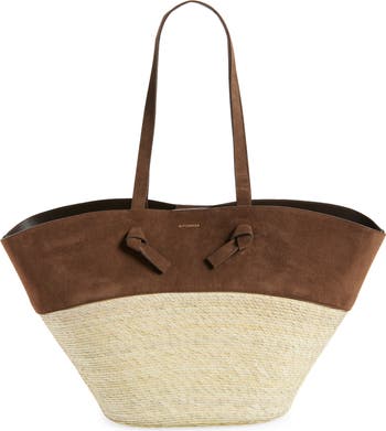 Crafted from a combination of soft leather and summery straw, this Spanish-crafted tote is finished with a glinting goldfoil logo and playfully knotted shoulder straps. A zip pouch helps keep small items organized within the roomy interior.