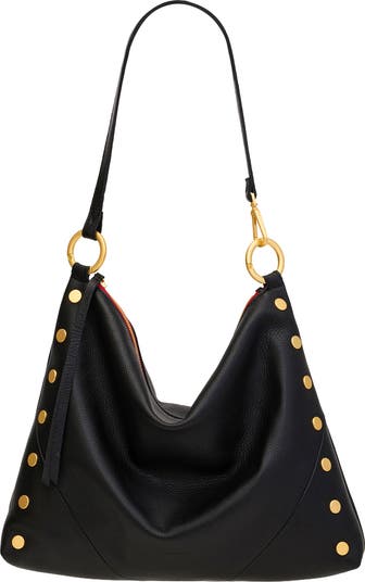 Armed with a sleek studded exterior and accented with Hollywood carpet-inspired red, this slouchy shoulder bag is spacious enough to carry all of the essentials with ease.