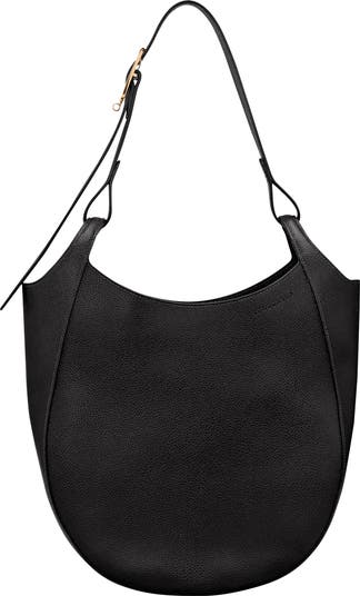 A subtle debossed logo highlights the streamlined profile and richly textured leather of a spacious hobo bag suspended from an adjustable shoulder strap for comfortable wear.
