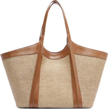 Smooth leather trims and an intricately woven exterior bring textural interplay to a voluminous shopper bag suspended from a pair of flat shoulder straps for comfortable wear.