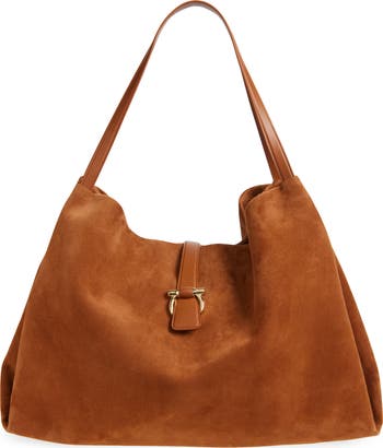 A softly structured silhouette with side bellows that evoke the petals of a lily defines this spacious tote made from supple Italian suede and finished with Gancio hardware.